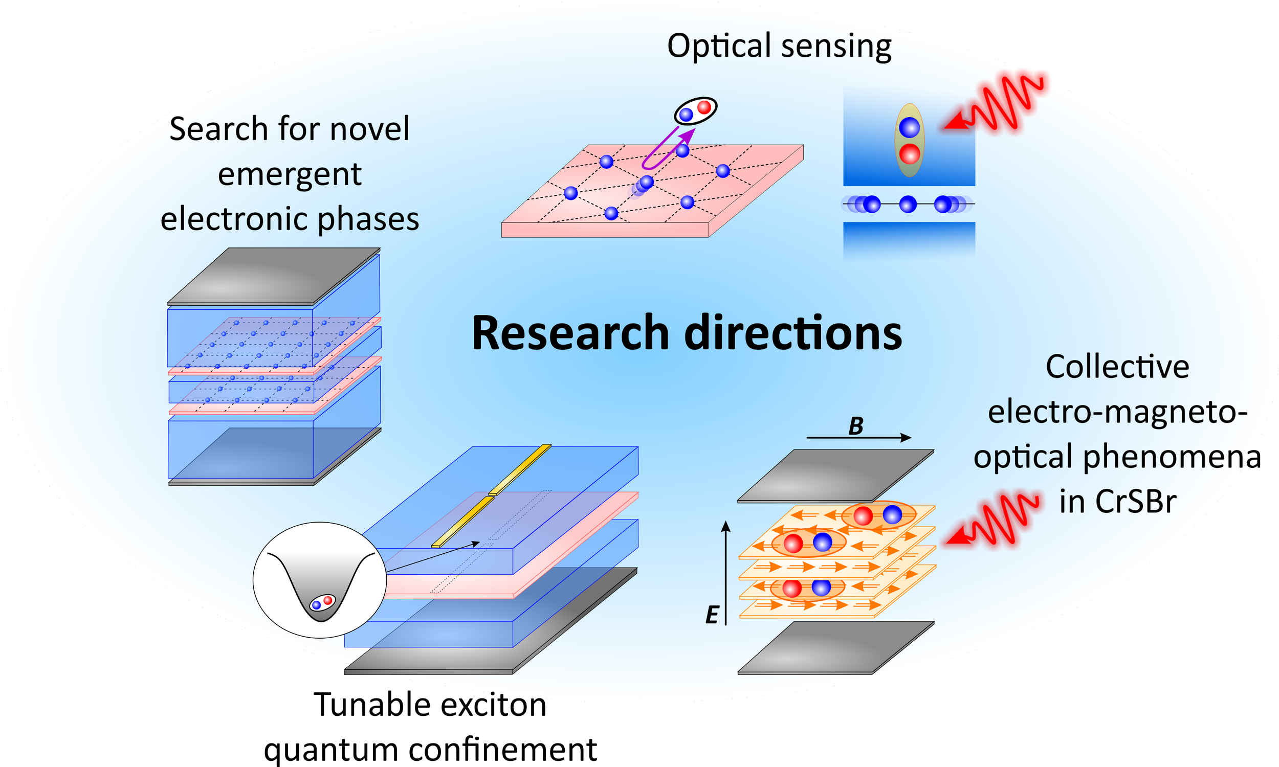 The broad family of vdW materials includes a class of layered magnets featuring a permanent spin order, which can serve as building blocks of future atomically-thin spintronic devices. Among them, there is a layered CrSBr that, in contrast to majority of magnetic materials, is a semiconductor with a direct optical band gap and ultra-strong light-matter coupling. This unique material hosts anisotropic Wannier excitons that are tightly coupled to the interlayer magnetic order, which allows for controlling excitonic wave-functions with external magnetic field. In our research, we will take advantage of these extraordinary properties to engineer and assemble gate-tunable CrSBr-based devices with the aim of exploring collective magneto-opto-electronic phenomena and push opto-spintronics to new frontiers.